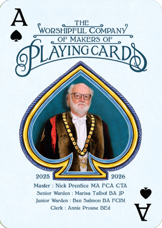 Since 1882 the Company has designed and presented an annual double pack of playing cards to each liveryman and freeman of the Company at the Installation of the new Master. Since 1888 a portrait of the Master has appeared at the centre of the Ace of Spades, and the design chosen and developed by the Master has traditionally commemorated an event of importance occurring in the 12 months leading up to the Master’s year in office.